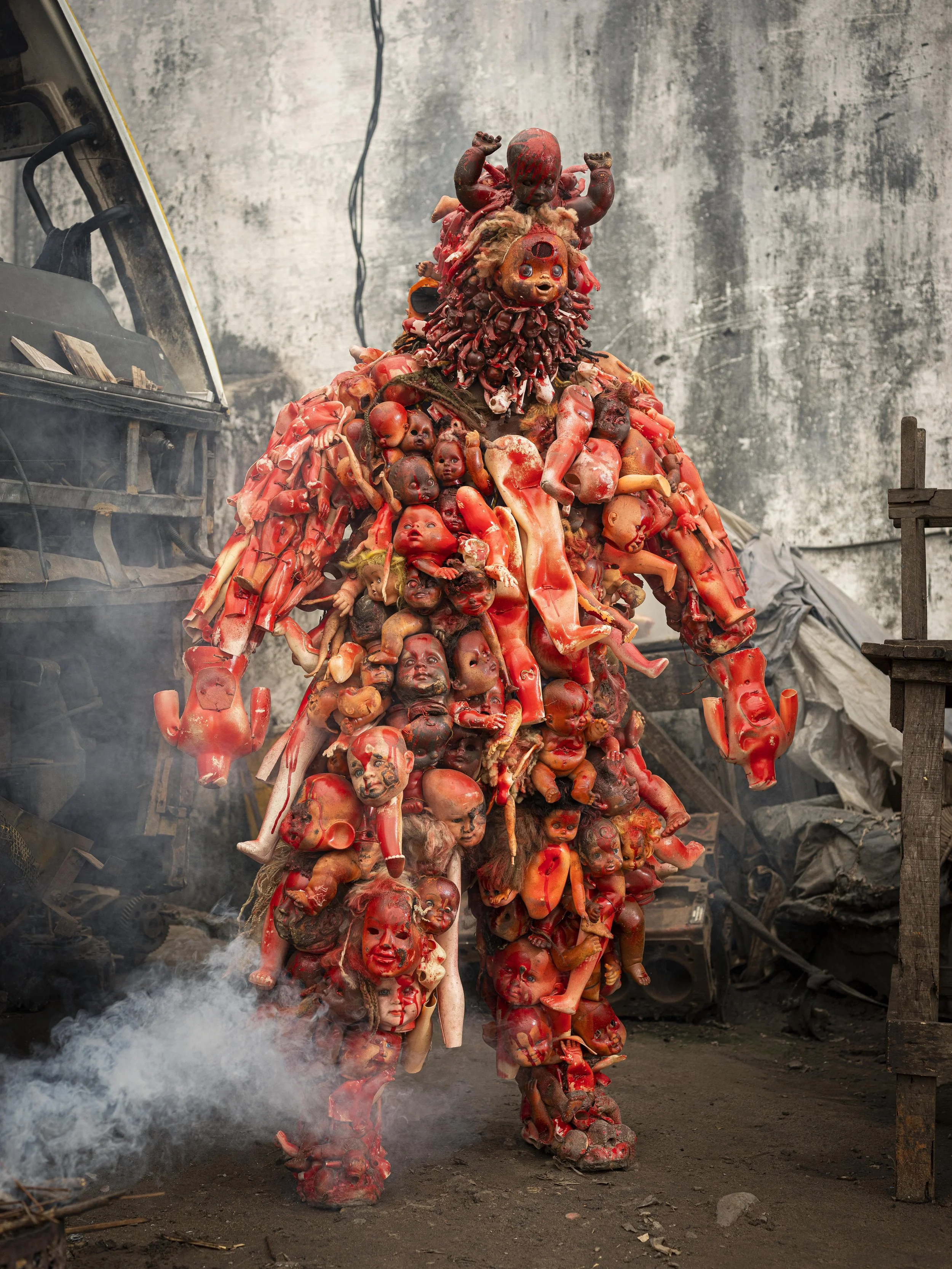Kinshasa is ‘the city of survival’ and if you have no other means, art is an exceptional way to expose abuses. Dolls found in rubbish dumps, radio parts and discarded flip-flops are among items used to create these surreal costumes by Congolese artists highlighting political and environmental issues.